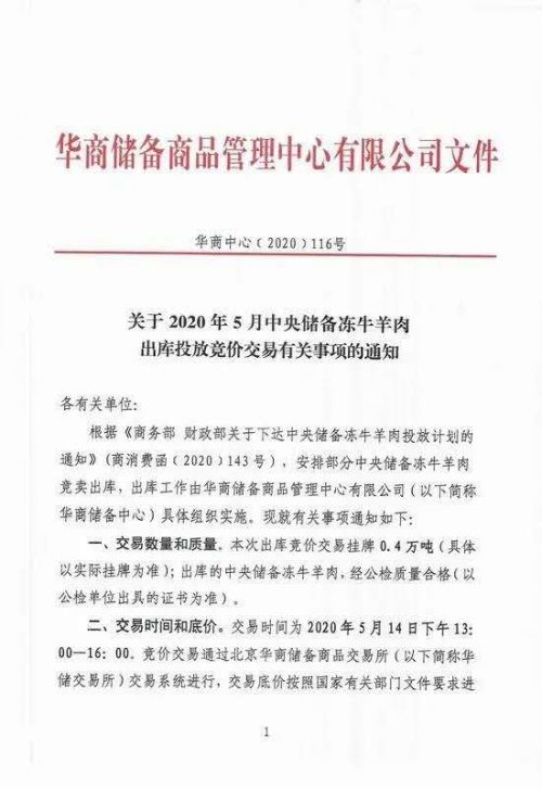 同日,華儲網(wǎng)還發(fā)布《關(guān)于2020年5月中央儲備凍牛羊肉出庫投放競價交易有關(guān)事項的通知》稱,5月14日將出庫投放競價交易0.4萬噸中央儲備凍牛羊肉。
