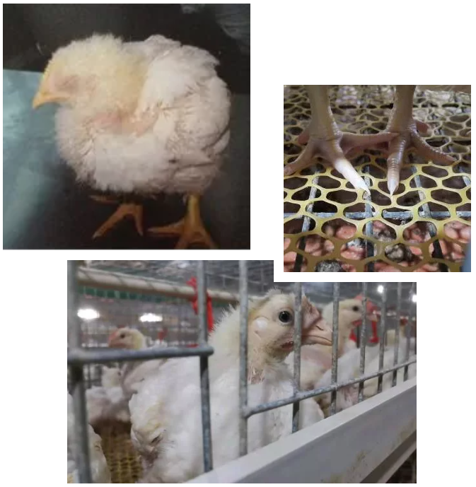 臨床上主要表現(xiàn)為采食不正常,刨料,愛吃細(xì)料;糞便不成形,消化不良,水便多,類似魚腸糞便、竹節(jié)糞便;雞群整體發(fā)育不整齊,形體瘦長,毛色晦澀無光,顏面灰白,腿及爪粉灰色漸漸蒼白色,細(xì)瘦無光澤,愛驚群瘋跑,也常縮頭耷尾;隨著病程發(fā)展,采食可能嚴(yán)重減少,有的甚至減少2/3,死亡增加。