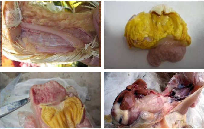 病情較輕的常常只表現(xiàn)為輕度腸道炎癥,腺胃稍腫或不腫,雞內(nèi)金在靠近腺胃接頭的部分稍有泛白腫脹,或有縱向的“芝麻口”, 或有輕度的潰瘍灶。病情重的雞嚴(yán)重消瘦,貧血,皮下干癟無脂肪,嗉囊空虛或有少量積液,骨骼發(fā)育不良;腸道變細(xì),內(nèi)容物稀薄,有西紅柿樣或魚腸樣糞便;腺胃腫脹如球,發(fā)硬或者發(fā)軟,有的萎縮變?。患∥缚s小,肌肉層變薄,手捏綿軟無張力;肌胃角質(zhì)層潰瘍,呈現(xiàn)火山口狀、老樹皮狀潰瘍灶,易剝離,嚴(yán)重者完全潰爛如破布樣,底層出血;單純性肌胃腺胃炎病雞內(nèi)臟其他部分除了發(fā)育不良外,多無肉眼可見病變。