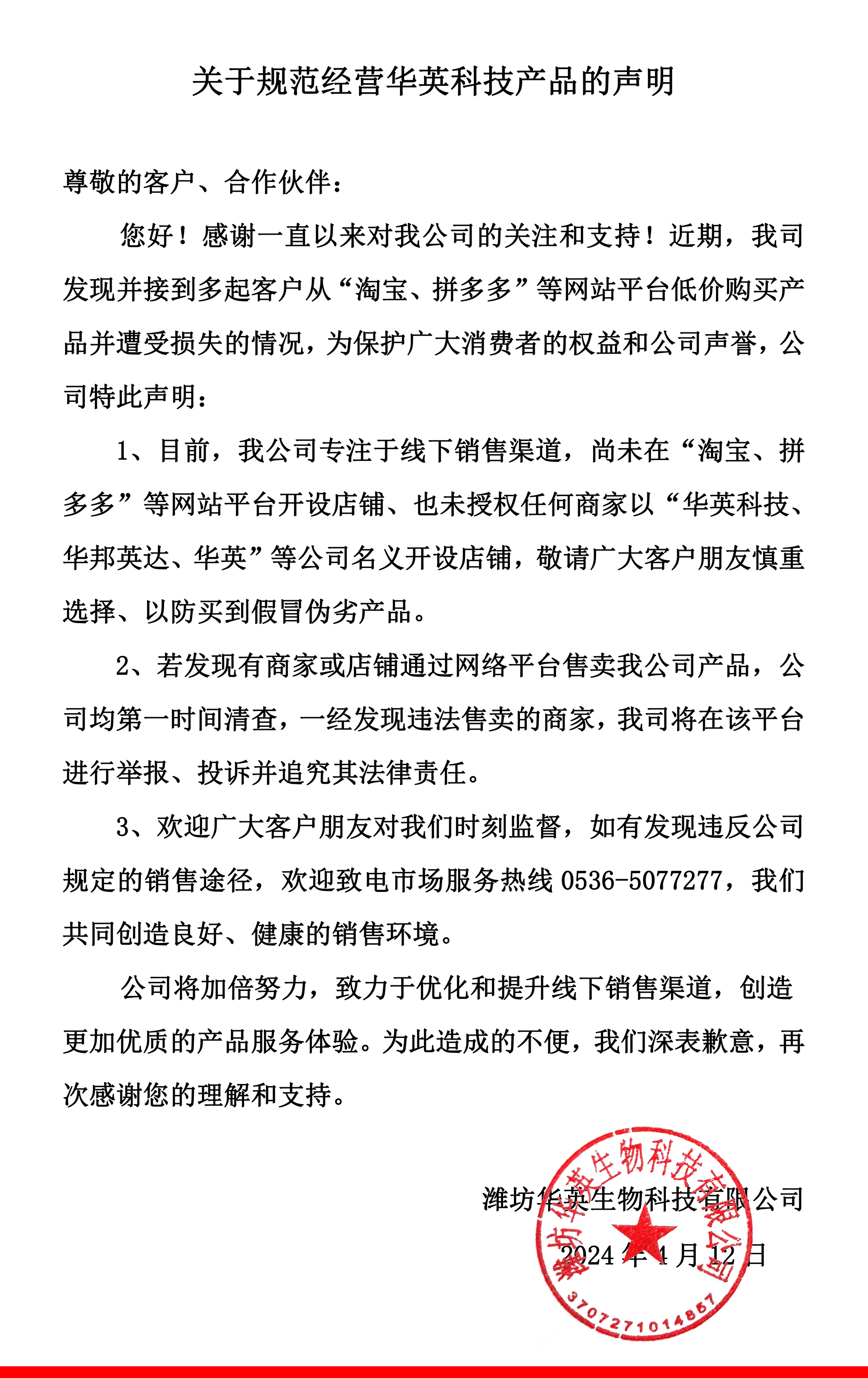 關(guān)于規(guī)范經(jīng)營華英科技產(chǎn)品的聲明