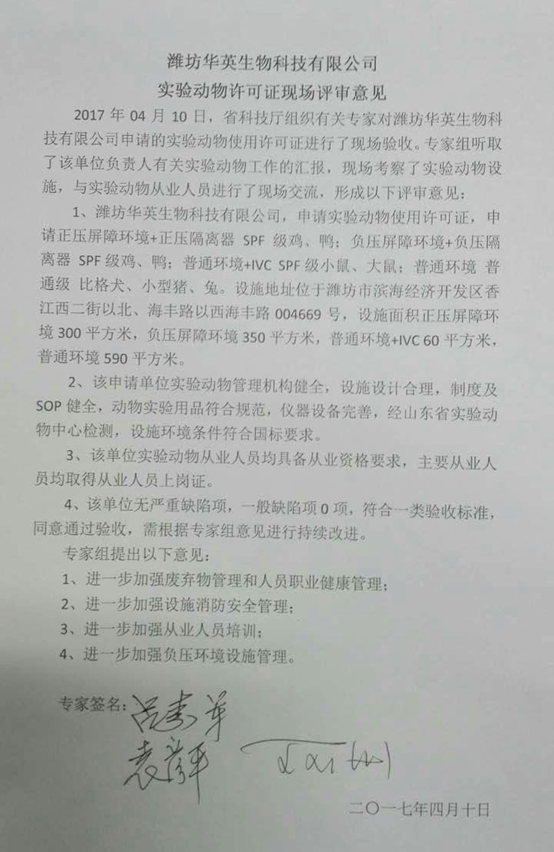 喜訊:2017年04月10日濰坊華英生物實(shí)驗(yàn)動(dòng)物房通過(guò)省實(shí)驗(yàn)動(dòng)物中心驗(yàn)收,符合一類標(biāo)準(zhǔn)。為公司下一步抗體產(chǎn)品的上市打下堅(jiān)實(shí)的基礎(chǔ)!