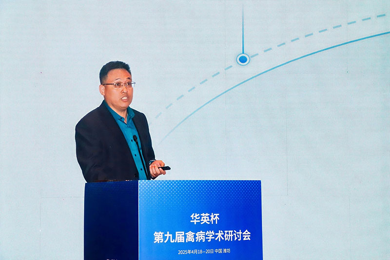 華英科技集團研發總監王宏華博士做《雞源鴨疫里默式桿菌的流行及防控新技術》主題報告,通過雞源鴨疫里默氏桿菌的流行趨勢及相關數據,揭示了其血清型復雜多變、藥敏結果和體內效果差距較大等防控難點。針對這一現狀,他系統闡述了公司針對鴨疫防控方面取得的新技術。該技術通過莢膜多糖類似物刺激產生黏膜免疫抗體,結合中藥清解合劑解表雙重功效,通過飲水使用,在家禽胃腸道產生大量的抗鴨疫黏膜抗體,有效預防鴨疫里默氏桿菌的發生,該技術并已獲得國家發明專利。
