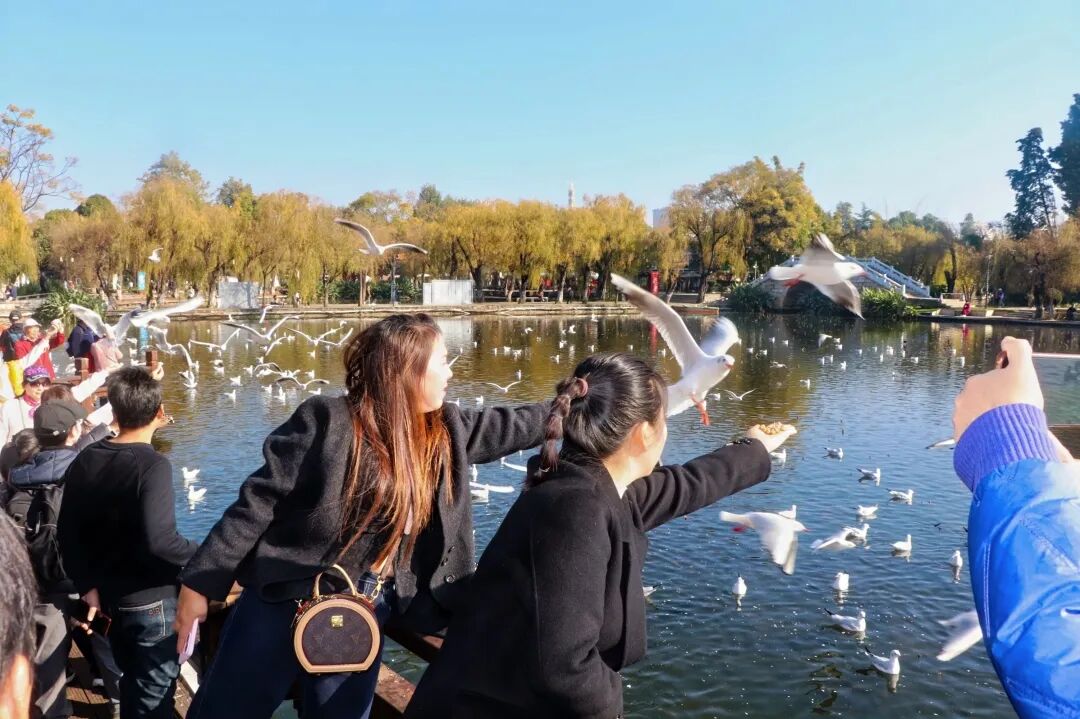 清晨,團隊前往滇池畔的歷史名樓——大觀樓。時值候鳥季,成千上萬只海鷗翩躚而至,客戶們親手投喂,與這些遠道而來的“白色精靈”親密互動,歡聲笑語與鷗鳥鳴唱交織成趣,生動詮釋了人與自然和諧共處的美好意境。