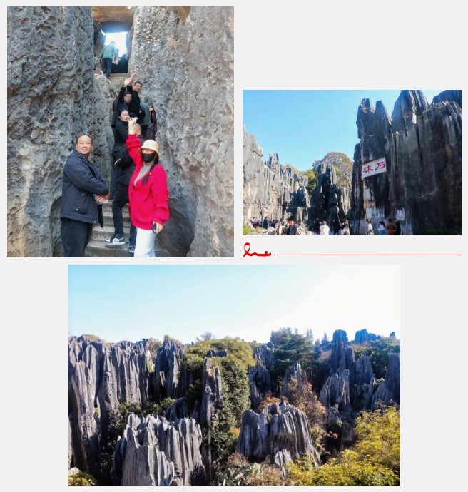 午后,團隊走進被譽為“天下第一奇觀”的世界自然遺產——石林。在這片億萬年前形成的喀斯特地質奇觀中,大家穿梭于巨石森立、路徑幽深的峰林之間,仰望千姿百態的象形石景,無不驚嘆于大自然的鬼斧神工與歲月沉淀的磅礴力量。這場融合了生態之美與地質之奇的壓軸之旅,為此次“幸福云南游”畫上了充滿回味與驚嘆的句號。
