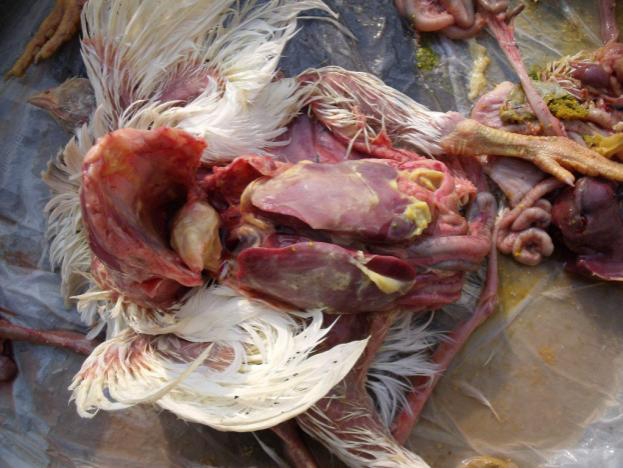 1、病毒性氣囊炎:每年的十月份到次年六月份,溫差較大,加之雛雞生理發(fā)育不完全,前期對溫差不敏感,在現(xiàn)有飼養(yǎng)管理條件下一些弱雞首先感染進而全群發(fā)病。雞群出現(xiàn)閉眼、低頭呆立狀況,甚至出現(xiàn)呼吸困難、張口伸頸、咳嗽甩鼻,病程較長者,怪叫、發(fā)出“呼嚕”聲、精神沉郁、體溫升高、無食欲、聚堆或呆立一側(cè)、排白色便或黃綠色稀便、生長發(fā)育不良、采食量下降嚴重,有的重癥雞只趴在地上嘴微張喘氣。病毒易引起組織損傷,導致炎性滲出,導致肺炎、氣囊炎、支氣管堵塞、同時伴有嚴重的包心包肝等現(xiàn)象。因為氣囊炎激發(fā)支氣管堵塞的死亡的雞,肚皮朝上。