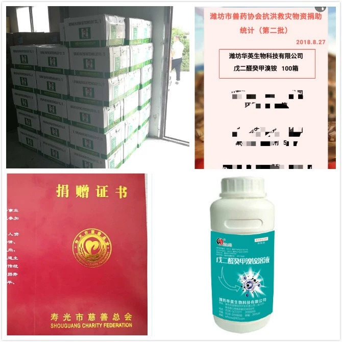 近日,因受臺風“溫比亞”危害而遭受洪澇災害的山東壽光、青州等地引起了全國人民的廣泛關注。農田被淹、大棚倒塌、洪水倒灌村莊、大量牲畜溺亡,受災群眾達百萬人,財產損失達百億多元,形勢十分嚴峻。“一方有難,八方支援”,為防止災后出現疫情,減少疫情蔓延,華英科技緊急向災區捐贈300多箱戊二醛癸甲溴銨消毒液,全力協助災區人民災后重建,幫助災區人民共度難關。
