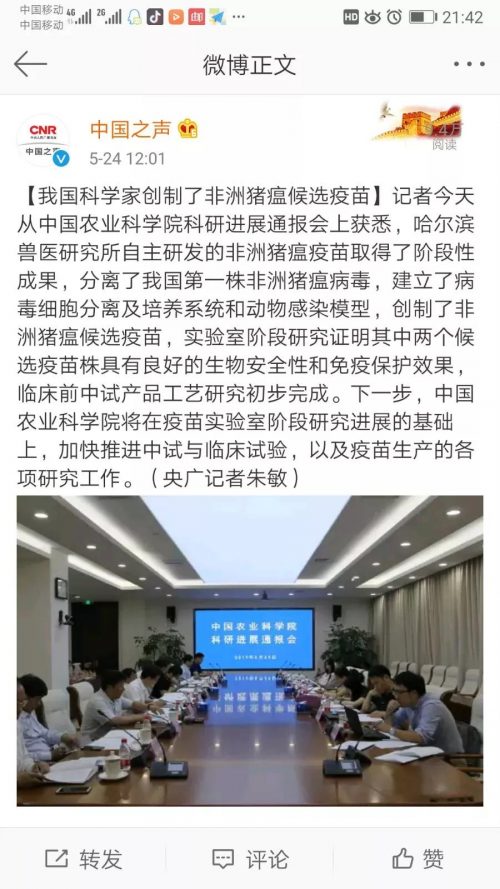 【農業農村部】非洲豬瘟疫苗研發取得階段性研究進展!