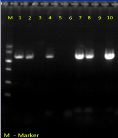 M為Marker ??1-4泳道為尿囊液,7-10為病料,5-6空白對照