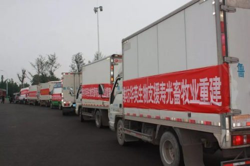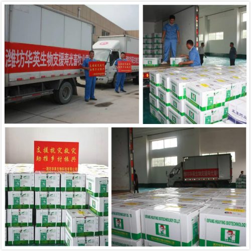 在了解災情后,在濰坊市獸藥協會和濰坊市農業農村局的號召下,濰坊華英生物科技有限公司積極響應,支援隨行人員在董事長張總的囑托與安排下,在8月14日下午,將價值80000元的愛心物資送到了受災區壽光,助推壽光恢復生產,幫助受災群眾早日渡過難關。