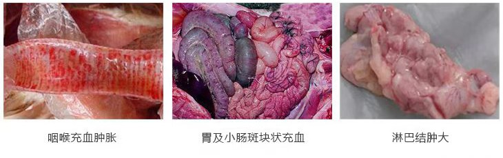 剖檢可見喉、氣管及支氣管充滿含有氣泡的黏液并充血腫脹、肺間質增寬、淋巴結腫大充血、脾腫大、腸胃有斑塊狀充血、胸腹腔、心包腔積液。