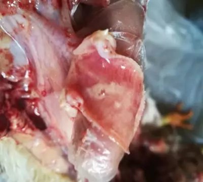 江蘇宿遷一肉雞養殖場,4棟棚,存欄40000羽,35日齡,最近一周一直出現死亡,每天死亡100只左右。大群精神沉郁,采食量下降,每天大約吃0.24斤料,吃料嚴重不跟天。大群呼??人缘谋容^多,大部分雞群眼圈拉長、發紅流淚。剖檢變化主要是喉頭出血、氣管有粘液、心肌出血、腺胃出血、氣囊炎、胸腹氣囊混濁、有黃色滲出物。