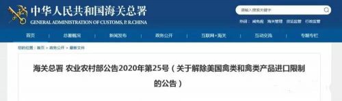 2019年11月14日,海關(guān)總署與與農(nóng)業(yè)農(nóng)村部聯(lián)合發(fā)布2019年第177號(hào)公告,宣布自本公告發(fā)布之日起,解除原質(zhì)檢總局、原農(nóng)業(yè)部聯(lián)合發(fā)布的2013年第19號(hào)、2013年第103號(hào)、2014年第58號(hào)、2014年第100號(hào)和2015年第8號(hào)公告有關(guān)美國禽肉進(jìn)口的限制,允許符合我國法律法規(guī)要求的美國禽肉進(jìn)口。2019年11月22日和12月25日,海關(guān)總署又先后對(duì)外公布了美國172、177家禽肉企業(yè)的對(duì)華出口資質(zhì),發(fā)布了允許對(duì)華出口禽肉產(chǎn)品名單。2月14日,海關(guān)總署與農(nóng)業(yè)農(nóng)村部聯(lián)合發(fā)布2020年第25號(hào)公告,重申了2019年第177號(hào)公告的相關(guān)內(nèi)容。