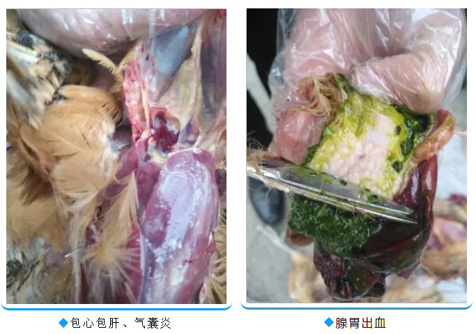 剖檢可見氣囊渾濁、有黃色干酪樣物,包心重、包肝輕,心內膜出血、肝臟紅腫、胰腺出血、腺胃出血、氣管發紅出血、肺臟淤血、出血。