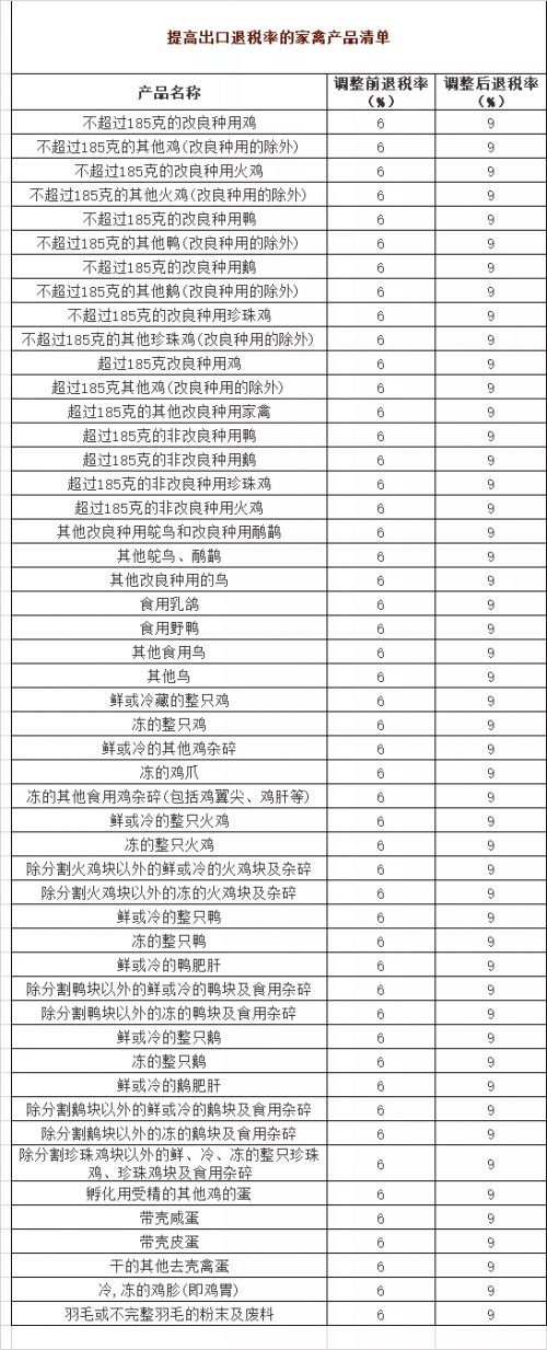 2020年3月17日,財(cái)政部、稅務(wù)總局發(fā)布《關(guān)于提高部分產(chǎn)品出口退稅率的公告》(財(cái)政部稅務(wù)總局公告2020年第15號),將瓷制衛(wèi)生器具等1084項(xiàng)產(chǎn)品出口退稅率提高至13%,將植物生長調(diào)節(jié)劑等380項(xiàng)產(chǎn)品出口退稅率提高至9%,其中50余項(xiàng)家禽產(chǎn)品的出口退稅率均提高至9%(見表1),這對家禽出口企業(yè)來說無疑是一大利好,有助于其進(jìn)一步開拓國際市場,不斷擴(kuò)大出口市場份額。